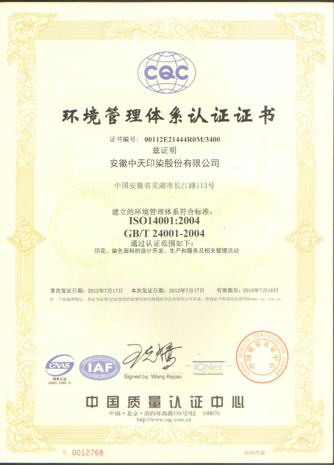2012年榮獲環(huán)境管理體系認證