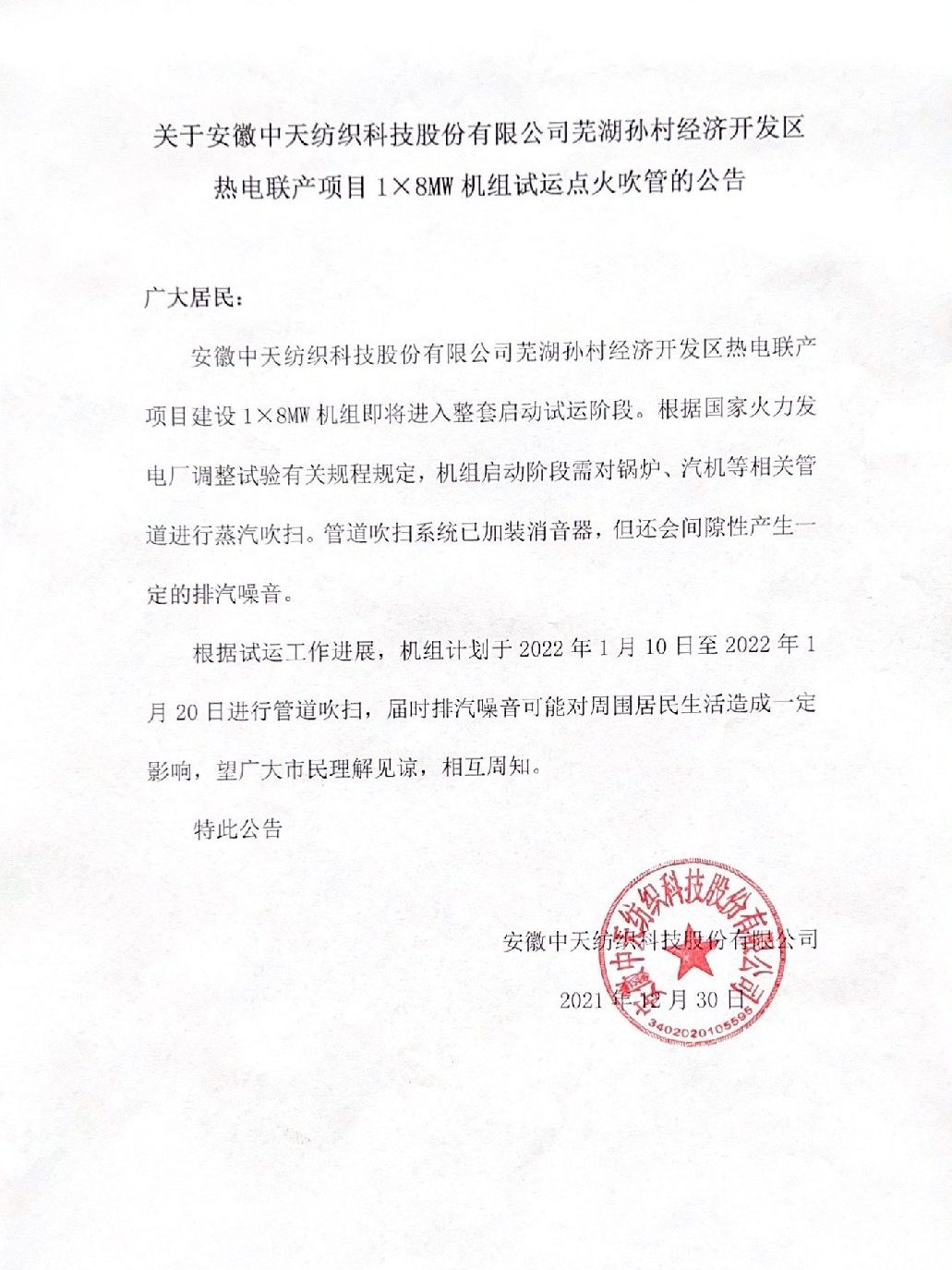蕪湖孫村經(jīng)濟(jì)開發(fā)區(qū)熱電聯(lián)產(chǎn)項(xiàng)目1X8MW機(jī)組試運(yùn)點(diǎn)火吹管公告
